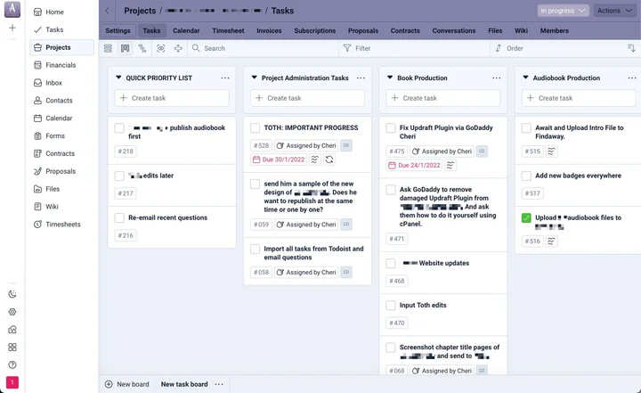 Cheri's favorite feature is Plutio's task boards. For each project, she uses four distinct task groups: