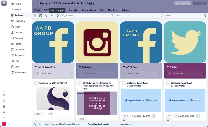 Cheri also uses Plutio to manage her content calendar. Each board represents a different social channel, with due dates on each task. She's created over 20 custom fields to denote content types - quotes, surveys, polls, community engagement posts, and more.